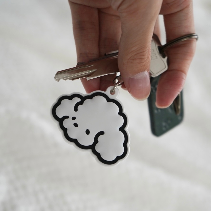 キーホルダーとして、どうしても重たい印象になってしまうため、白枠を追加しました。